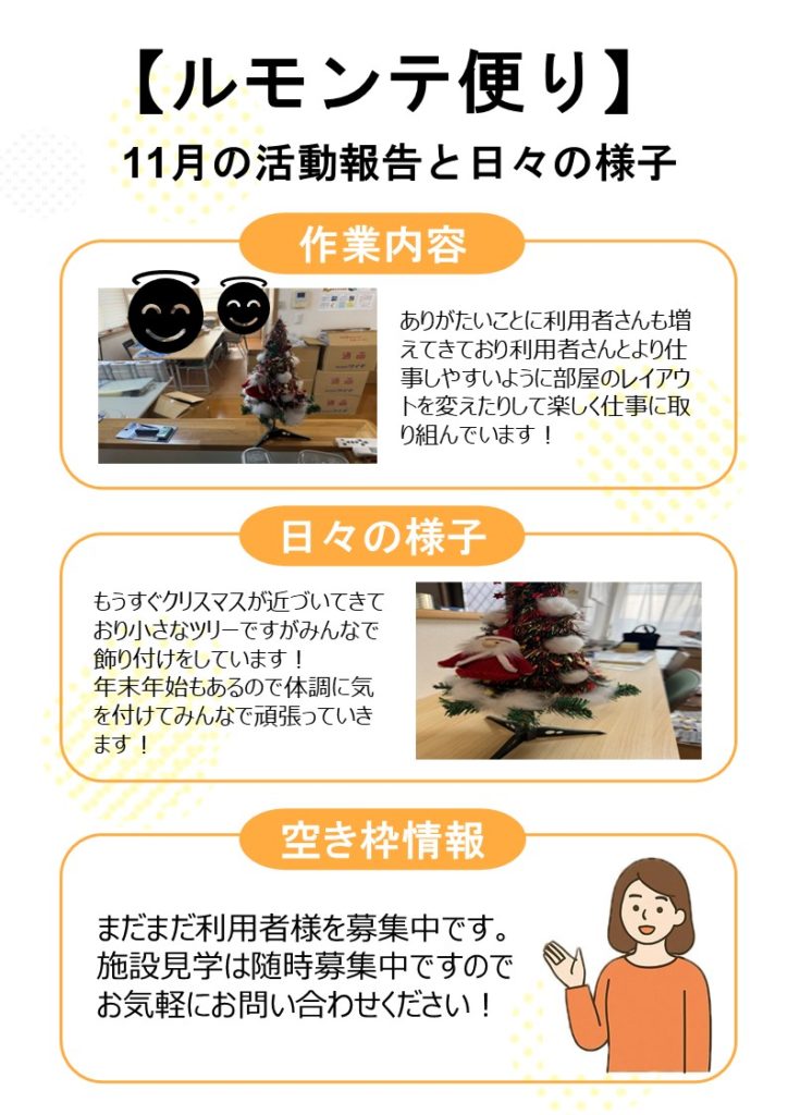 後一か月で今年も終わりますが利用者さん、スタッフ一同体調に気を付けて最後まで走りきりたいと思います!